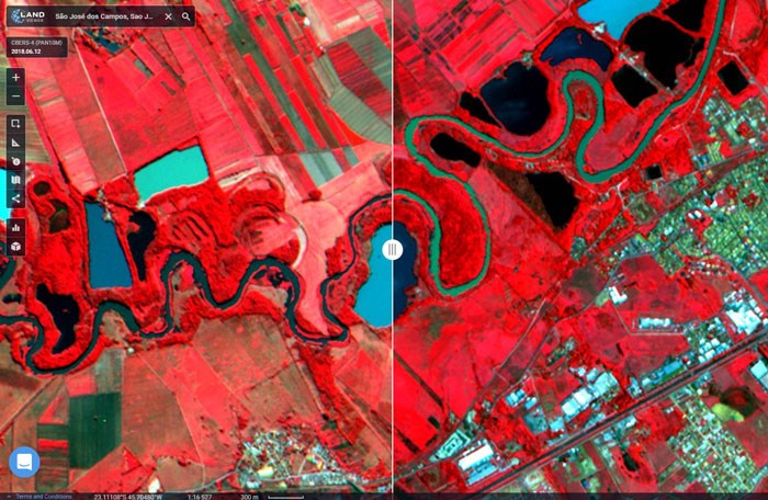 O serviço Land Viewer, da EOS, possui facilidades de visualização do acervo semelhantes às do Remote Pixel para as câmeras PAN, MUX e WFI. É possível também realizar, entre outras funções, a comparação entre imagens da mesma região adquiridas em datas distintas. Abaixo, um exemplo para a região de São José dos Campos.