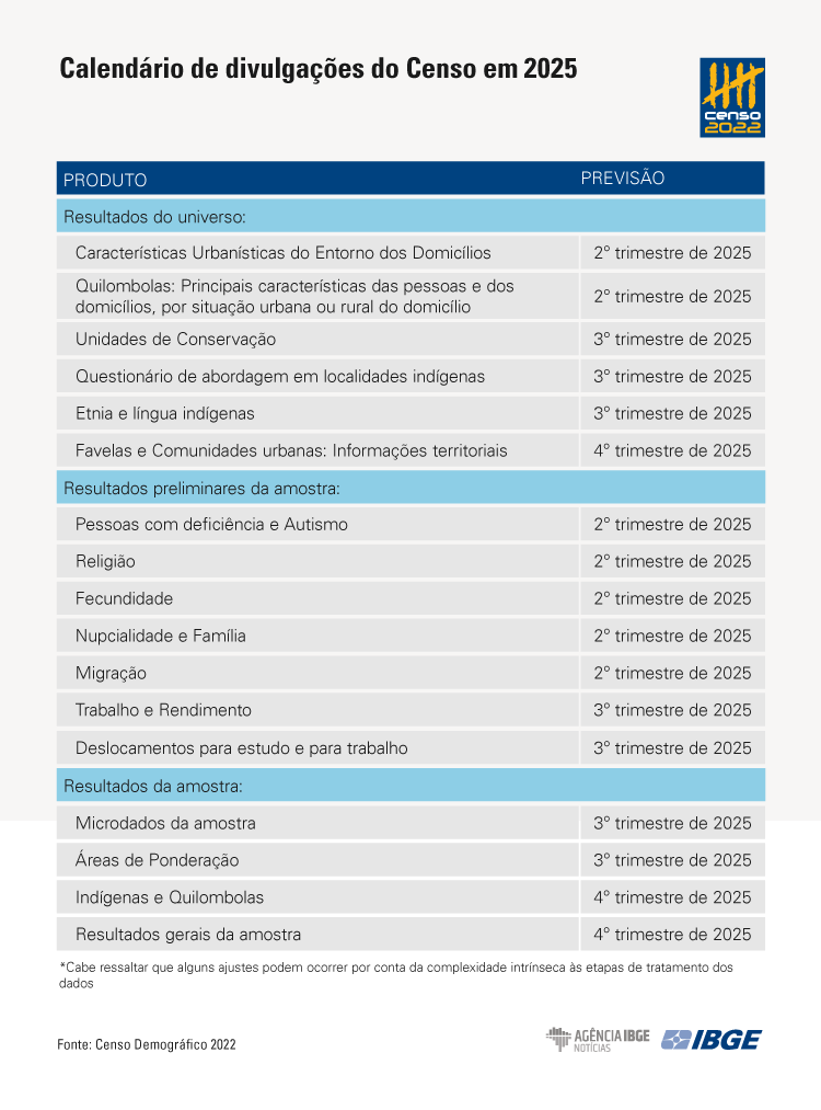 Uma série de informações coletadas no Censo Demográfico 2022 serão publicadas pelo IBGE durante 2025. O cronograma dos resultados apresenta trimestralmente a previsão de divulgações que contemplam temas como educação, religião, fecundidade, nupcialidade, pessoas com deficiência, autismo, trabalho e rendimento, migração e deslocamento para estudo e trabalho. Também estão previstos novos dados sobre as populações quilombola e indígena. Vale lembrar que, devido à complexidade das etapas de tratamento dos dados, poderão ser feitos ajustes no calendário.